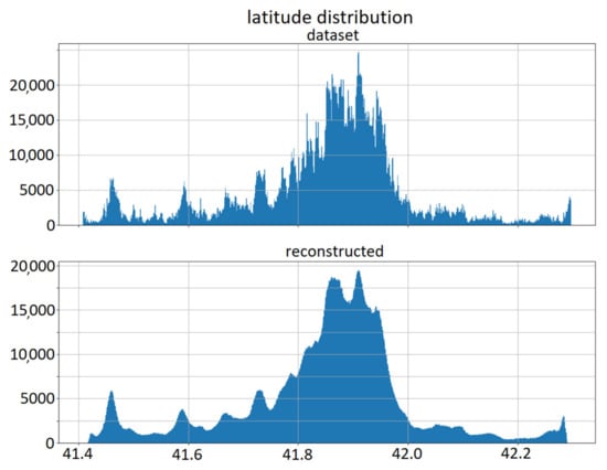 In Figure 7 and Figure 8, the reconstructed data for latitude and stop starting time are shown. The upper plot represents the dataset distribution, and the lower plot represents the reconstructed distribution. Similar plots were obtained for the other relevant quantities of the model. As can be seen from the juxtaposed plots, the obtained distributions are similar to the original ones; however, they still possess an intrinsic stochastic variability due to the use of the VAE architecture. This allows for the production of more data than those in the training set if needed, though with the same overall distribution.