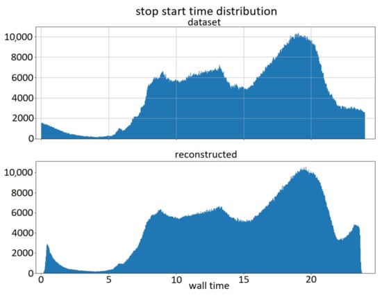 Stop starting hour comparison. Above: dataset distribution; below: reconstructed distribution.