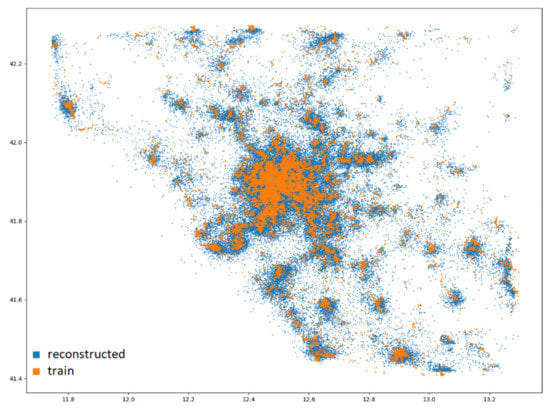 In Figure 9, the geographic locations of the first 30,000 stops are plotted to avoid clutter. The distribution of the dataset is in orange, and the reconstructed data are in blue.