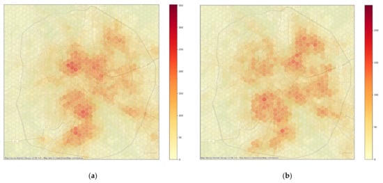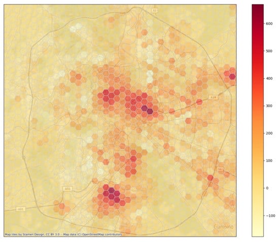Further work will also be aimed at checking the approach with a tiling technique for geographic localization, as in Figure 10 and Figure 11, since the goal of this work is to model traffic needs in terms of origin–destination matrices. Validation of these future implementations will be performed against different, larger, and more recent traffic datasets.
