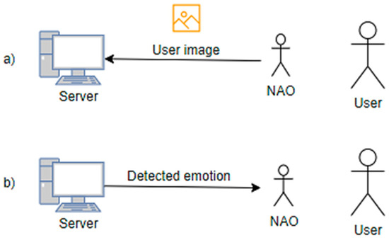 (a) NAO captures an image of the user and sends it to the server. (b) The server replies with the extracted emotion.
