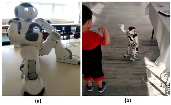 There is a growing interest in the use of social robots in the field of human–robot interaction (HRI). These robots range from being educational tools to means for treating patients, especially when used as assistant robots. A very promising candidate for HRI is the NAO robot, which is featured in many studies, especially when social interaction plays a crucial role [18,19,20,21]. In [18], the authors focused on autism spectrum disorder patients (ASD) and how their quality of life can be improved with the use of a social robot at an early age. In their study, they incorporated a neural network model that was able to generate meaningful answers that differed from the Seq2Seq model and the NAO social robot. Their experiments showed that the model surpassed the Seq2Seq model as well as the GAN-based one in both automatic and human evaluation. In [19], the authors proposed a face detection method in order to track ASD children’s faces during robot-assisted therapy sessions. The authors noted that social robots were generating positive reactions from children with ASD, and they aimed to use NAO as an agent in order to measure the concentration level of children during a 30 min interaction session, which was supervised by human doctors. In [21], a one-month experiment was presented, which was carried out in a home environment, featuring a social robot and a caregiver; the robot engaged in activities with children diagnosed with ASD. The activities featured emotional storytelling, perspective taking, and sequencing in order to increase the social communication skills of children. The results indicated that after the experiment, the children improved their joint attention skills and communicated more without needing the presence of the robot. In [20], the NAO robot was used as an assistant for elderly people. It was tested under a smart home robot system by eight older people in five real-world long-term and short-term scenarios. The humanoid robot was able to gain the participant’s trust, and during the long-term evaluation, the results showed that the participants developed an emotional connection with the robot, although the overall entertainment gained from the interaction with the robot diminished.