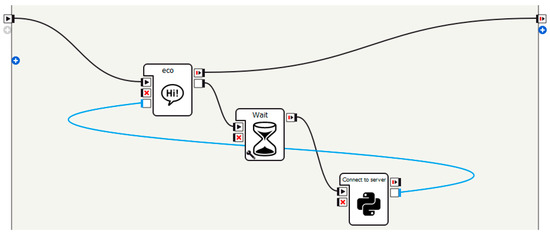 Choregraphe, a platform dedicated to creating software for SoftBank Robotics’ humanoid robots, was used for creating NAO’s behavior. This platform features a graphical user interface (GUI) and allows the use of “boxes”, which are Python scripts with specific functionalities. Most of the boxes are customizable, and the user can create new Python scripts in order to use a specific feature. The boxes can connect with each other to send and receive data. Figure 2 shows the project behavior that was tested under real conditions.