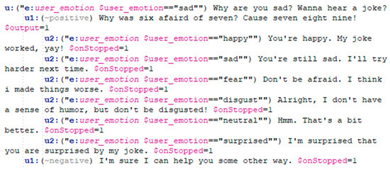 NAO’s ALDialog module allows the creation of human-like dialogs by utilizing a list of rules written by the user. These rules can be grouped in topics, and they should be categorized in appropriate ways. The two types of rules, user and proposals, are either triggered by user input, which links to a possible robot output, or by the robot itself with topic progression functions [17]. The user rules in the proposed method are triggered by an event bound to an input variable located on the box, which stores the detected emotion, passed on by the Python script. In Figure 4, the input variable is called “user_emotion”, and the event (symbolized as e:user_emotion) triggers every time an emotion is recognized. There is a separate rule for each of the emotions, which allows the robot to react with different and unique reactions for all of the emotions.