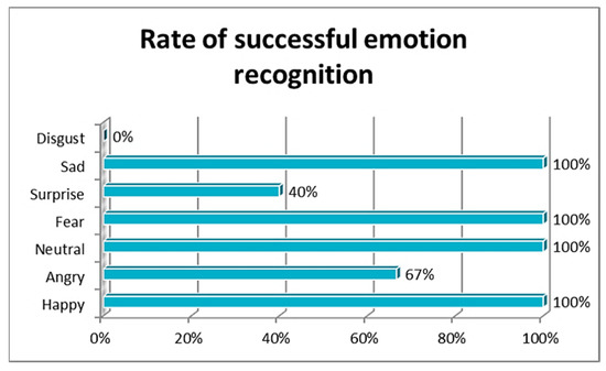 Overall, the test results were very encouraging. Out of 25 answers, 5 of them were found incorrect. The expressions that were shown to be the most confusing were anger (67% successful emotion recognition), disgust (unsuccessful recognition), and surprise (40% successful emotion recognition); meanwhile, sadness, fear, neutral, and happy emotions were recognized successfully. Light sources played a major role, and some of the participants’ pictures often appeared too dark or too bright, depending on the sun, as the assessment was conducted in a room with large windows. In these cases, it was decided that the evaluation should be run again with a new picture from the same participant.