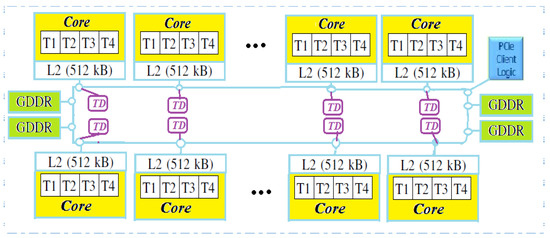 Intel MIC architecture was introduced as an alternative technology to GPUs. It is a multicore in-order Intel Architecture (IA) engine with hardware multithreading, multiple cores, and wide vector units. The in-order cores run at a relatively low frequency (around 1.2 GHz). The first product, Xeon Phi, was codenamed the Knights Corner and built on a 22 nm chip. Xeon Phi has over 50 × 86 Pentium architecture-based cores and 16 memory channels on-chip. An on-chip bidirectional interconnect provides high-performance communication to these cores, as depicted in Figure 1. The memory channels can offer 5.0 GT/s bandwidth, with the support of memory controllers [4].