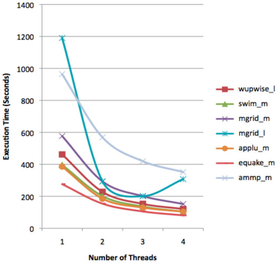 As described earlier, each node in the surveyor system has four cores; each one can run four hardware threads. We exhaustively experimented with the number of OpenMP threads from one to four on three datasets: test, train, and ref. Some benchmarks failed execution due to system administrative constraints on resources such as CPU cycles, and memory footprint. For example, major benchmarks execution, using the ref dataset, failed due to either runtime or compile-time errors related to memory outage. Each node in the surveyor system has 2 GB of memory. Other benchmarks failed because they exceeded the maximum execution time of 1 h. Some dataset workloads are very small and outdated as compared to these powerful parallel machines, which makes parallelization overhead (also known as fork-join overhead) much more than benchmark execution time. For illustration, Figure 4 presents the execution time of benchmarks using the training dataset after excluding benchmarks that failed execution, as well as those with a serial execution time of fewer than 100 s.