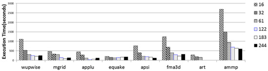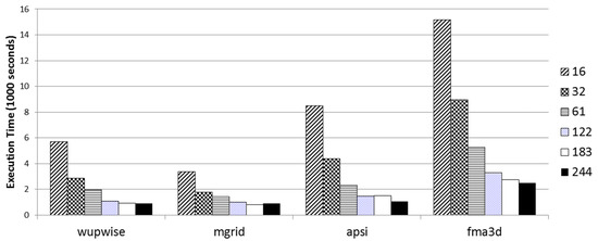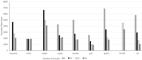 Each node in VESTA has 16 cores and can handle 64 hardware threads. Saving time and effort, we tried varying the number of OpenMP threads from 1, 2, 3, 4, 8, 16, 32, and 64. Figure 5 shows the execution time of the SPEC OMP2001 suite using the large ref dataset over 8, 16, 32, and 64 threads for the VESTA machine.