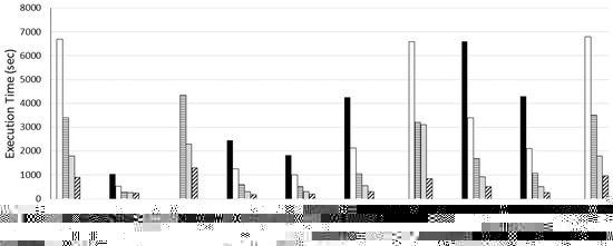 Figure 13 and Figure 14 compare Xeon Phi and Vest using large and medium benchmarks, respectively. We included only benchmarks that successfully finished execution on both architectures. Intel Xeon Phi, on many moderate cores, provides comparable performance to the Blue Gene system at a much-reduced price. One reason could be that the MIC clock frequency is barely higher than the Blue Gene frequency, but the key benefit is gained from the Xeon Phi’s ability to cope with multi-core as well as SIMD concurrency, maintaining low synchronization overhead.