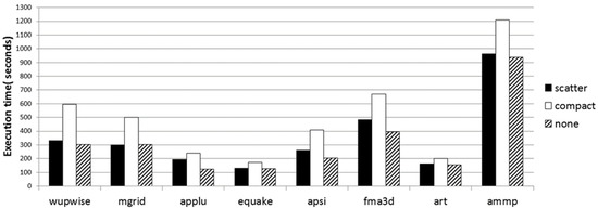 Effect of threads affinity on performance. SPEC OMP execution time is measured on Intel Xeon Phi with different modes (scatter\compact) using a large dataset.