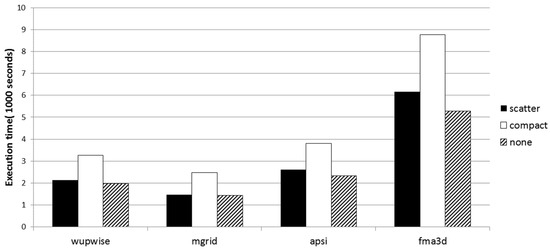 Effect of threads affinity on performance. SPEC OMP execution time is measured on Intel Xeon Phi with different modes (scatter\compact) using the medium dataset.
