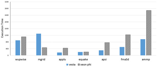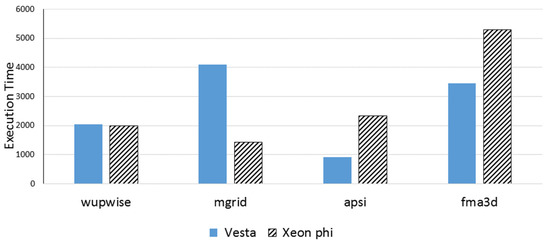 There are various existing studies on performance analysis of either Blue Gene or Xeon Phi parallel systems. However, few studies considered both platforms in their evaluations, and they concentrated on one specific application [26,27,28]. In our evaluation, we used a full suite of applications, with several datasets on both Xeon Phi and Blue Gene platforms. To the best of our knowledge, no previous study used the SPEC OpenMP suite in their evaluation of both platforms.