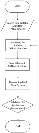 Figure 1 shows the frame of methodology for developing the proposed model. This framework consists of five steps: the search for a suitable standard ArSLA dataset, the search for suitable CNN models, selection of the best CNN model, the development of a real time recognition system, and validation of the developed real time recognition system. In the following, each step is presented and discussed.