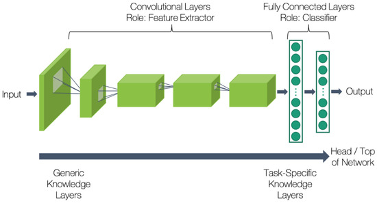 CNN can be fed raw image pixel values rather than pre-processed feature vectors, unlike standard machine learning applications. Figure 4 shows the general architecture of CNN [21]. CNN’s usual architecture is made up of layers of computing units (gates), which are: