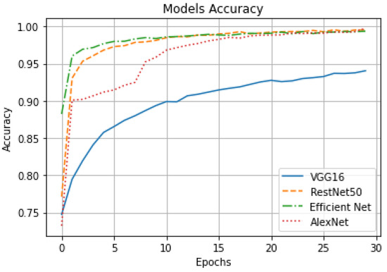 According to [26], accuracy is the best benchmark to compare between CNN architectures. Accordingly, experiments have been conducted for testing accuracy among the four selected CNN architectures. Experiments were conducted according to the following steps:
