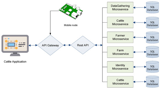 The cattle-health-monitoring system was built using an MVC pattern design, API gateway, Rest Web API, and microservices for database communication. The gateway did not store any information. The microservice architecture was deployed on the cattle-monitoring cloud platform using the deployment illustrated in Figure 3.