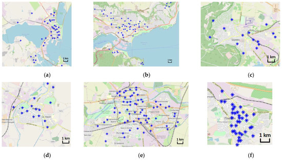 Simulation schemes for cities in Bulgaria. (a) T1 Burgas; (b) T2 Varna; (c) T3 Shumen; (d) T4 Yambol; (e) T5 Plovdiv; (f) T6 Pleven.