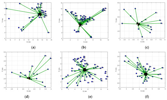 Figure 2 shows simulation diagrams of the WSN’s access to the measuring points for the six cities in Bulgaria. A star topology was used. Most nodes that are close to the base station (up to 2 km) are in cities T1, T2, T4 and T5. The nodes are presented with blue points and green lines show the two-way communication with the base station. Some of the green lines are not visualized by the used software, but there are calculations for the nodes.