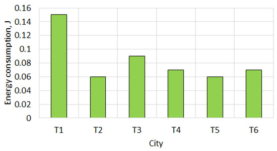Figure 3 shows a graph of maximum energy consumption in wireless sensor networks for different cities in Bulgaria. The maximum energy consumption for the entire WSN in every city is presented. The highest energy consumption is observed in the cities T1 and T3. In T1, this is due to the many nodes that are located near the base station. In T3, the characteristics of the geographical location of the sensor nodes with network communication have a significant impact and increase the energy consumption in the network. Similar conditions are observed for the T6 network. Although T2 and T5 are significantly larger cities than the others, their average energy consumption is significantly lower compared to the networks in other cities.