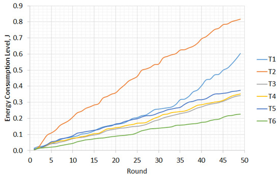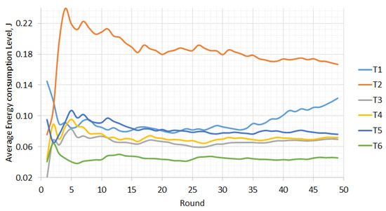 Figure 6 shows the level of power consumption in wireless sensor networks, depending on the number of rounds. The greater the number of nodes in the network, the greater the energy consumption. For example, T2 has 59 nodes and, compared to the others, has the highest values of energy consumption. Although some networks also have a large number of nodes, their energy consumption is lower due to the shorter transmission distances.
