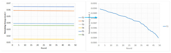 Figure 5 shows the remaining energy level in the wireless sensor networks, depending on the number of rounds. The highest levels of residual energy are observed in the T2 and T5 networks. As can be seen from the previous graphs, in these networks, the maximum and average levels of energy consumption are maintained during operation of the network. For this reason, these two networks operate more energy efficiently than the others. The lowest residual energy levels are observed in T4. Although there are fewer nodes, the distances in the city are not great (up to 4 km). This makes the location of the nodes close to the base station and therefore increases the amount of data exchanged between them. A zoomed example for T1 is given. The changes are in the range near 0.0006 J.