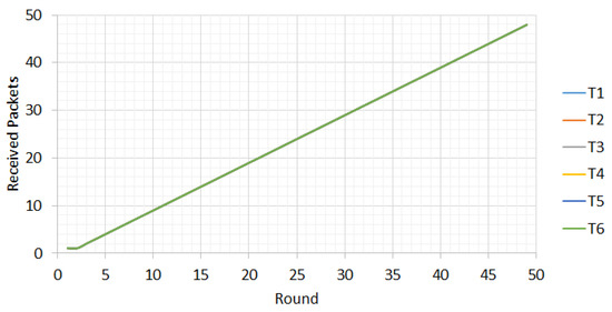 Figure 7 shows the number of packets received (Np) in the wireless sensor networks in relation to the number of rounds. As can be seen from the graph, the number of packets received increases as more rounds mean more data are transmitted to the base station. With the number of rounds, the number of received packets remains high enough. It can be seen that different plots are overlapped. The six curves are close to each other, showing that for the six WSNs, there is no clear trend showing that the number of packet losses on a long path is higher than that on a short path, otherwise the nodes should receive more packets with a smaller number of rounds.