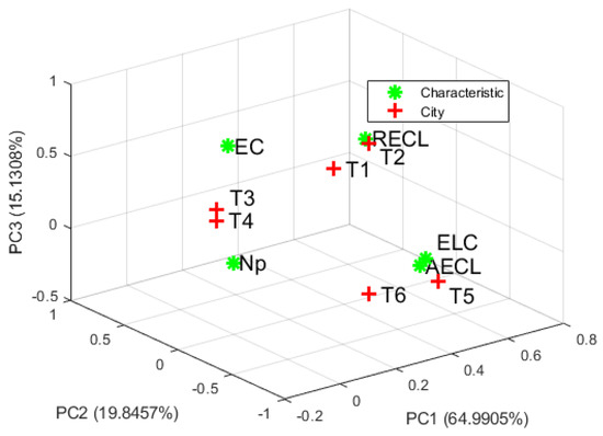 The first three principal components were chosen because they describe a variance in the data of over 95%. The results are shown in Figure 8. PCA analysis is used to show the cities, grouped by their specific WSN energy consumption parameters. There is a grouping of cities, depending on energy consumption in the WSN. The coastal cities T1 and T2 are in a common group, where the remaining energy level in the network has the highest values. The smaller cities T3 and T4 are in a common group and their total energy consumption is the best compared to other cities. Networks with approximately the same radii in cities T5 and T6 are in a common group and their average level of energy consumption has the best characteristics compared to other cities. The number of received packets remains in the center of the coordinate system, which shows that it is the same for all cities.