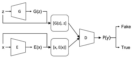 Though the generator (and accordingly encoder) and the discriminator are trained separately, there is only one single objective function computed by the discriminator D. Both the generator and the encoder are updated indirectly through discriminator. Different from the standard GAN approach, a concatenation operation is added in the discriminator. The concatenation is to link the data x (or ) with its latent space (or z) and these two concatenated data are then inputted into the discriminator. When optimized, the G and the E are the inverses mapping to each other [19,20] which can be shown as and .