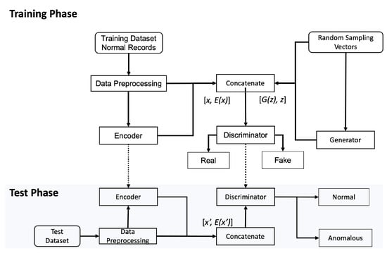 Efficient GAN [17] utilized BiGAN’s ability of inverse learning and demonstrated that it can be effectively used to detect anomalies not only on images but also on network intrusion datasets such as using the KDD99 dataset. In their approach, they introduced two similar losses as f-AnoGAN to form the anomaly score function. Since the encoder and the generator can compose an auto-encoder structure, ref. [10] suggests adding an Autoencoder style training step to the original BiGAN architecture to stabilize the model.