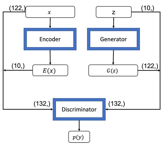 As for the input to the generator, the vectors are randomly drawn from a normal distribution of the real dataset to match the size of the latent space dimension (e.g., 10 input vectors according to the latent space with the size of 10). The output size of the generator is decided according to the size of features (e.g., 122 neurons according to the total size of features in the training dataset). As our encoder does the inverse mapping of the generator, the input size corresponds to the size of the total features (e.g., 122) while the output size is the size of the latent space (e.g., 10). The input size of the discriminator is equal to the concatenation of the output of the generator and its input (e.g., 132) while the output size is a single neuron (e.g., as a binary classifier). Figure 4 illustrates the data flow of the three components of our BiGAN model based on the analysis of the NSL-KDD dataset.
