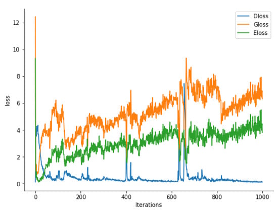 Training losses vs. iterations. Eloss, Gloss, and Dloss represent the training loss trend of encoder, generator, and discriminator, respectively.