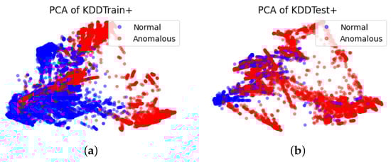 The PCA visualization of data distribution in (a) KDDTrain+ and (b) KDDTest+ dataset.
