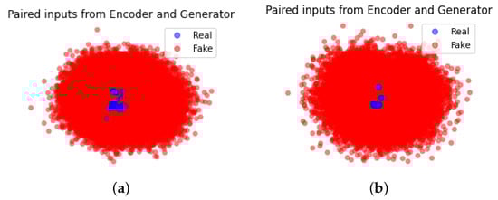 Figure 7 illustrates the PCA results of the encoder and the generator after training when: (a) represents two paired concatenated outputs when trained on the NSL-KDD dataset while (b) represents the results on the CIC-DDoS2019 dataset. As shown in the two graphs, the real samples are condensed into clusters while the generated samples surround those real samples with overlapping. This indicates that the generator can simulate the data distribution of normal/BENIGN samples of the datasets to some extent. However, the fake samples scatter around a much broader area than the real samples which can be regarded as the anomalies for the discriminator in the training process.
