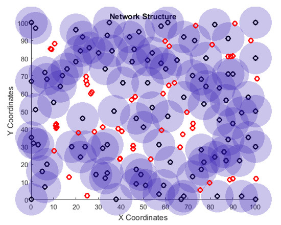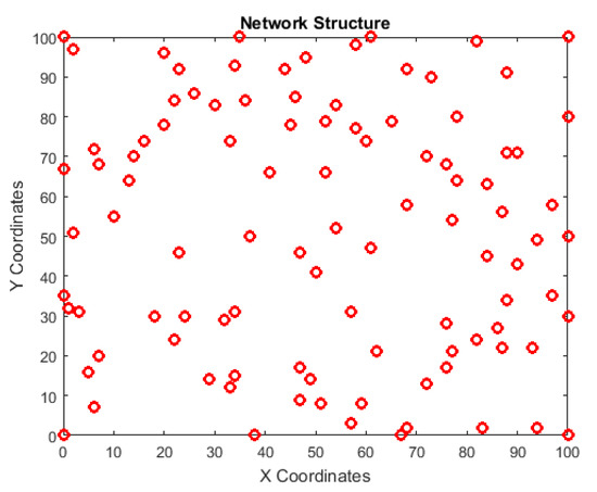 WUSN with a size of 100 m × 100 m with 100 randomly deployed sensor nodes. The network plot was created using MATLAB software.