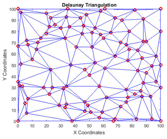 The target region is divided into Delaunay triangles with each sensor node as a point in the geometry. Delaunay triangulation (DT) and Voronoi diagrams (VDs) [33,34] are two imperative and fundamental data structures of computational geometry that share the property of duality and play a key role in solving many problems. The property of duality states that the Delaunay triangulation of any set of points P corresponds to the dual graph of those set of points in P. Circumcenters of DT correspond to the vertices of VD. Delaunay triangulation for a given set of points P is a triangulation DT(P) with the property that no point in P lies inside the circumcircle (a circle passing through the vertices) of any triangle in the triangulation. In other words, any two points connected by an edge in DT exist iff a circle passing through these points exists that does not contain any other point inside. The minimum angle amongst all achievable triangulations is maximized in DT. We took a target region of 100 m × 100 m (shown in Figure 1) with 100 sensor nodes randomly deployed in the network.