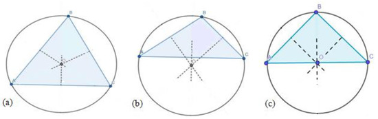 Circumcircle around a triangle using ⊥ bisectors: (a) acute triangle; (b) obtuse triangle; (c) right-angle triangle.