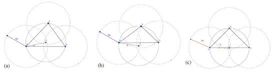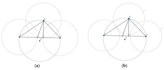 where Ar represents the area of the triangle. To compute the area of △ABC, we apply a formula to ‘calculate the area of the triangle for coordinate geometry’ evinced in Equation (2). As shown in Figure 1, each point has its coordinates on the x- and y-axis. Therefore, taking sensor nodes A(,), B(, ), and C(, ), and circumcenter O(, ),