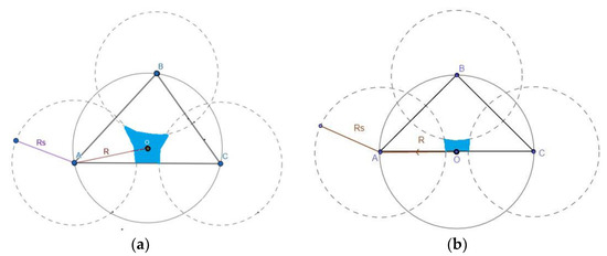 As shown in Figure 7, even if Rs < R, there may be no hole (Figure 7a), or a hole may be present (Figure 7b). To find out if there is a coverage hole or not, we can perform some mathematical calculations with the help of geometry.