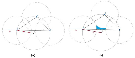 If the sum of areas of the triangles made with the circumcenter as one point (ArΔAOB + ArΔBOC + ArΔAOC) is equal to the area of ΔABC and the sensing radius of the sensor nodes (Rs) is less than the circumcircle radius (R), then there must be a hole (shown in Figure 6). As the sensing radius is less than the circumcircle radius, there must be some area around the circumcenter that remains uncovered. In acute and right-angle triangles, this area falls within the triangular region generated by sensor nodes and is called a coverage hole.