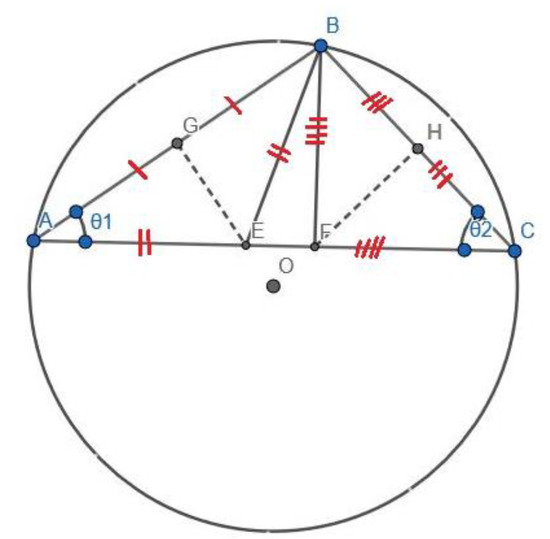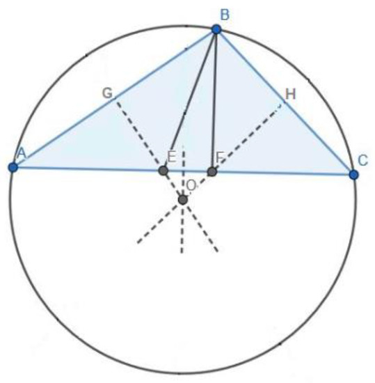 Using Equation (3), we can find all three sides, AB, BC, and AC, and take two smaller sides (here AB and BC) for further calculation. GE and HF are ⊥ bisectors of sides AB and BC, respectively (shown in Figure 10).