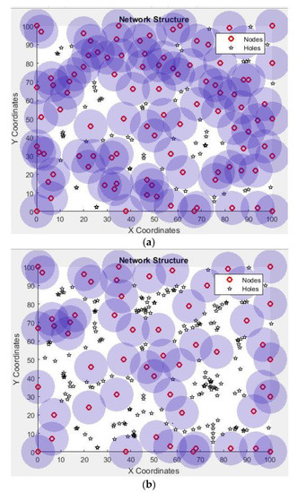 After the identification of holes in the beginning, we ran Algorithm 2 for 500 rounds and recorded the performance of our coverage hole detection algorithm. Figure 12a,b represent two intermediate hole detection results that show an increasing number of holes due to the failure of nodes with time. Here, in our simulation, we set 10% of the total nodes as advanced nodes having energy (Ea) two times that of the energy (E) of other nodes. The motivation behind capturing this scenario is to view the change in the network with time, viewing the failure of nodes and increasing holes.