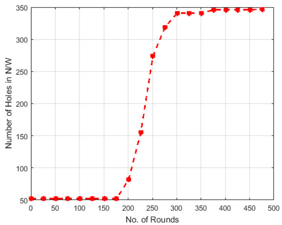 In Figure 13, we can see that up to the first 175 rounds, there was no new hole. The nodes communicated with each other using Algorithm 2, and no node failure was observed until 175 rounds. The number of holes exponentially increased in the next 100 rounds as the sensor nodes in the network started failing due to the loss of energy. Increasing the number of holes in the network clearly shows that node failure will increase with an increase in the hole size due to the higher energy consumption of other active nodes and will ultimately lead to more failures. To further analyze this, we checked how many times our coverage hole detection algorithm had to run in the network lifetime. As mentioned in Algorithm 2, the hole detection algorithm is run whenever there is a new dead node in the network.