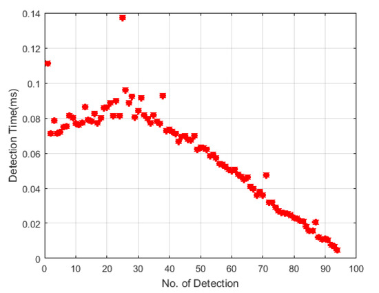 Figure 14 shows that the hole detection algorithm was run around 95 times during the entire lifetime of the network, i.e., there was a new dead node found; this shows the detection time taken by the algorithm in every run. When we compare Figure 13 and Figure 14, it can be seen that the detection time was longer when there were more active nodes in the network. After a time when there was a sudden rise in the number of dead nodes/holes (as shown in Figure 13), the detection time reduced. The algorithm detected holes in the network with a size of 100 m × 100 m, with 100 sensor nodes having a sensing radius of 8 m, in less than 0.1 millisecond, and this was further reduced when the number of nodes reduced in the network.