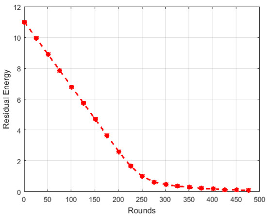 Number of rounds vs. residual energy. Residual energy is measured after every fifty rounds.