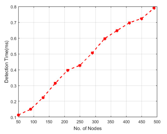 We changed the sensing radius of the sensor nodes to 2 m and varied the number of nodes in the network in a range of 50–500 with an increase of 40 nodes after each iteration. After randomly deploying nodes in the 100 m × 100 m area, we ran the hole detection algorithm to observe the change in the hole detection time with an increase in the number of nodes in the network.