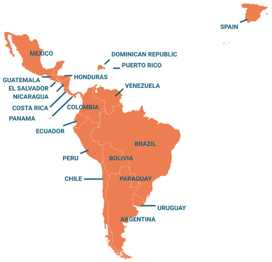 A total of 623 professors from all areas of knowledge and from universities located in Spain and the following 19 Latin American countries participated in the study: Argentina, Bolivia, Brazil, Chile, Colombia, Costa Rica, Dominican Republic, Ecuador, El Salvador, Guatemala, Honduras, Mexico, Nicaragua, Panama, Paraguay, Peru, Puerto Rico, Uruguay, and Venezuela (Figure 1). The participants were chosen through a non-probabilistic convenience sampling process and all of them responded to a survey about their experience of using VR in learning environments in university classrooms that was sent to them through GoogleFormsTM. Professors responded to the survey voluntarily, freely, and anonymously. All responses were validated (only those responses in which all questions were answered were considered).