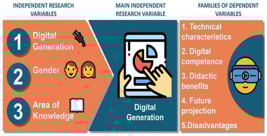 To achieve these objectives, this study distinguishes the following independent variables (Figure 2): (i) digital generation of the participants (dichotomous variable whose values are immigrants and digital natives); (ii) gender (dichotomous); and (iii) participants’ area of knowledge (dichotomous). Regarding the latter variable, two major areas have been differentiated, following the International Standard Classification of Education (ISCED), which is the classification established by the United Nations Educational, Scientific and Cultural Organization (UNESCO) [52]: scientific-technical area (composed of the areas of Science, Engineering, Agriculture and Health) and humanistic-social area (composed of the areas of Arts, Humanities, Social Sciences and Law and Services). All independent variables are nominal and dichotomous.