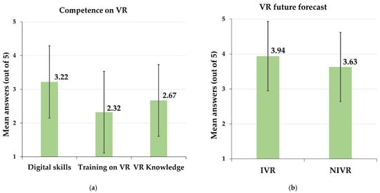 The participating professors gave very high valuations to VR as a didactic tool and intermediate-high to its disadvantages and to the possibilities of future implementation in the university. However, they gave lower valuations to their own digital competence and in relation to the use of these technologies (Table 7). Regarding the drawbacks of VR, the costs and the training required to use it stand out (Figure 3). Economic viability is a well-known limitation of the didactic applicability of VR. However, some studies show that the costs of its implementation are decreasing as the technological development increases [55]. Regarding competence in the use of VR, the assessment of the training received on its use is particularly low (Figure 3). These results are in line with other studies which proves that the self-concept of digital competence of professors at different educational levels, areas of knowledge, and geographic location is usually low [56,57,58]. Typically, the low perception of professors’ own digital competence is associated with the lack of experience in the use of digital resources for learning or with the lack of specific training [59]. Although the self-concept of digital competence is not the only variable that should be considered to estimate the digital competence of teachers [60], the low valuations in this regard suggest the need to strengthen faculty training and promote the use of digital teaching technologies by universities.