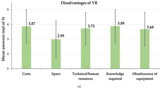 Means and deviations of the different questions of the subscales with high standard deviations: (a) competence on the use of VR; (b) future forecast of VR in higher education; and (c) disadvantages of VR.