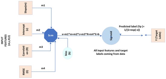 Logistic regression model [33] is useful for the binary classification problem and the architecture is shown in Figure 1. Logistic Regression, like linear Regression, is a statistical machine learning method. It categorises the data by looking at outcome variables at the extreme ends. Logistic regression generates a logistic curve with a range of 0 to 1 [34]. Sigmoid activation function is mathematically modelled as shown in Equation (1) and it gives the output value between 0 and 1 [35]. As the Sigmoid activation function is in LGR model that is useful to predict the probability to exist ZCP in the signal. Complete training algorithm to update the model parameters (m1, m2, m3 and m4) and bias parameter (b) using stochastic gradient decent (SGD) optimizer [36] is presented in Algorithm 1. The cost function that is used in this problem is binary cross-entropy [37,38] that is mathematically modeled as shown in Equation (2). Training process of logistic regression model with sample calculations is presented in Appendix B.